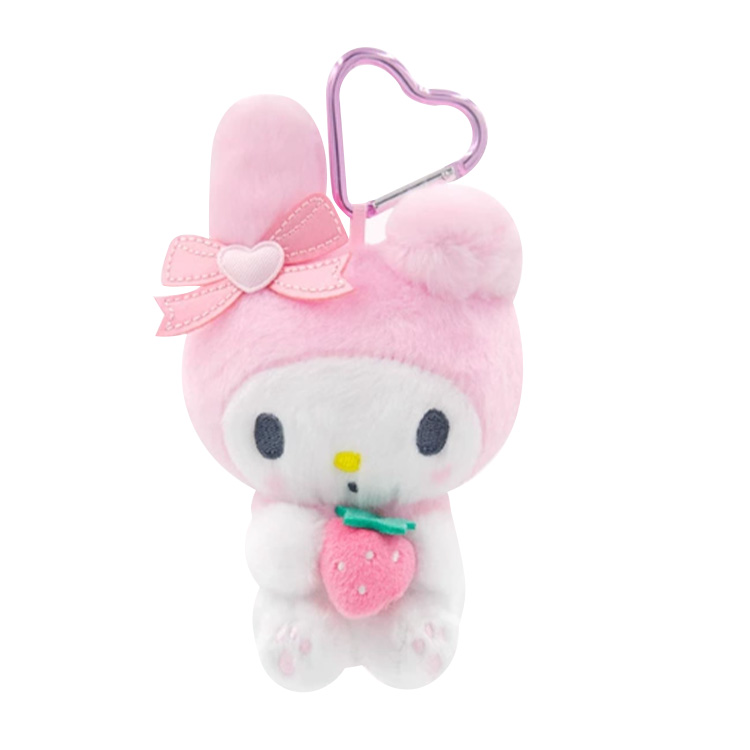 My Melody: My Melody plush toy keyring is mainly made of pink and white plush fabric. In its arms is a small strawberry, and there is also a pink heart-shaped decoration on its head. Its face is all white. Its eyes and nose are sewn with thread, very delicate. There are also small claws on its feet, which are very cute.