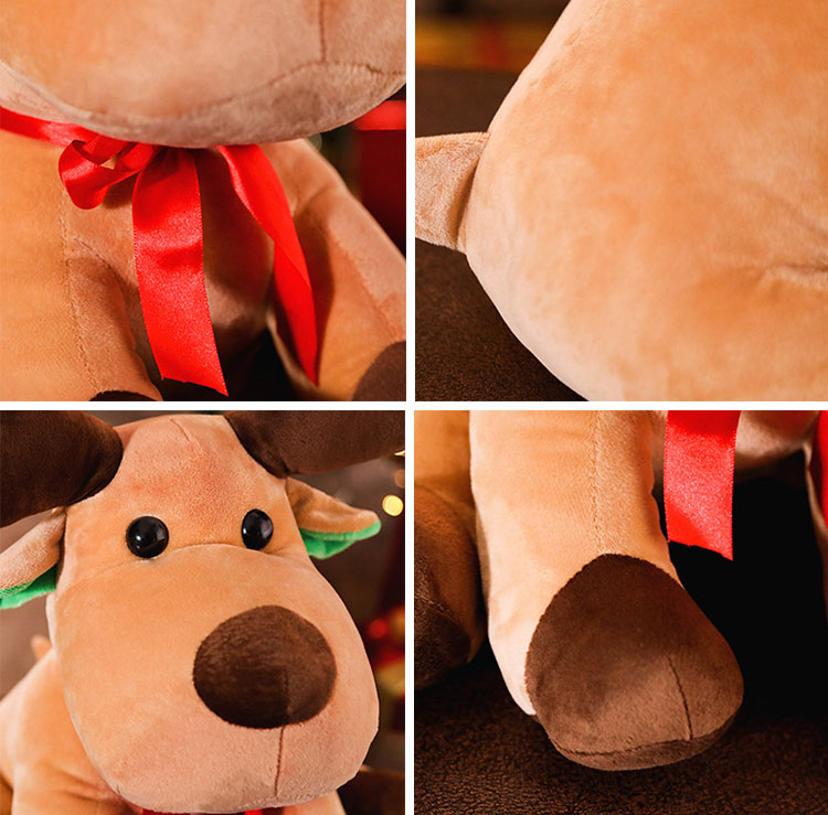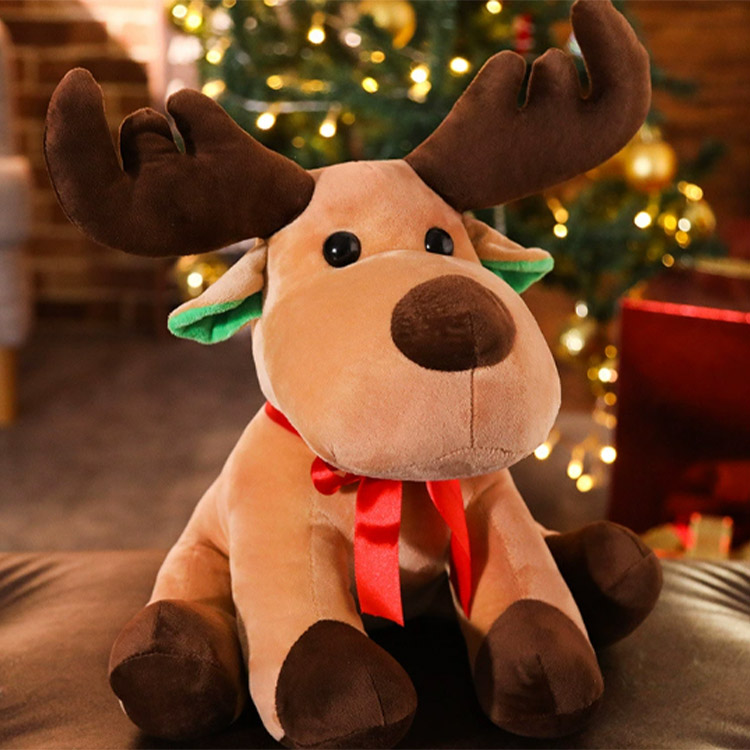 This reindeer plush toy is in a very warm light brown color. The pair of brown antlers on its head are very cute and exaggerated. Its round black eyes, dark brown nose, and the green accents inside the ears give it a sleek and three-dimensional look. The bright red bow tied around its neck adds to the festive atmosphere. The soft appearance of this little deer makes one immediately feel joyous during the holiday season, as if it could bring you a gift at any moment.